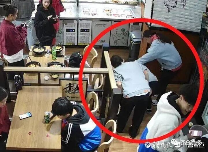 记者来到位于聊城金柱大学城校区南门附近的杨国福麻辣烫店了解情况。店老板张洪鑫向记者展示了一段店里的监控视频,监控视频显示,10月23日上午11时50分左右,小谭和同学来到店里就餐,小谭刚吃了几口,就被卡住了喉咙,他就立马跑进了洗手间,但是又立马跑了出来。