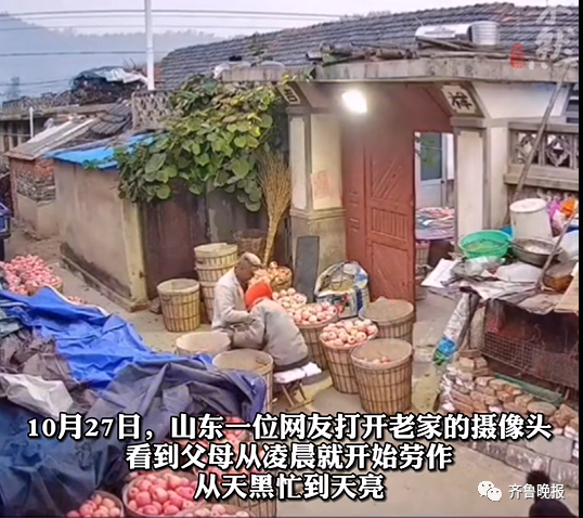 10月27日,烟台一段视频感动众多网友视频中,儿子通过监控,看到家里父母的忙碌身影,父母从天还没亮就开始起床干活,非常辛苦。