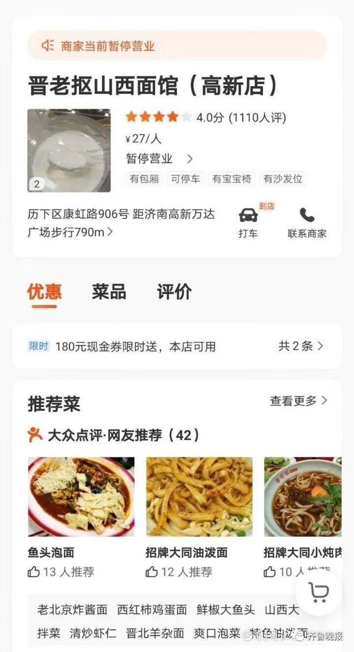 济南晋老抠山西面馆关门歇业。