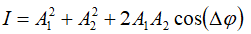 式中n是介质的折射率,此时相位差只与两列波相遇时走过的路程有关。当两列波在空间中不同的位置相遇时其走过的光程是不一样的,但在这一点其相位差是恒定的。在有些地方相位差为0,则此时合震动取最大值,而有些地方相位差为π,合震动取最小值,相位差的变化是连续的,对应于干涉项则是连续的周期性变化。对光波而言,震动越强光强就越大,也就是越亮,因此就是明暗相间的干涉图案了。