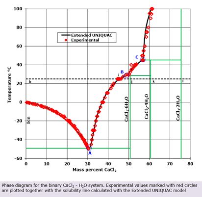 但是其实这是一个动态平衡的过程,不断地有水分子脱离这个结构同时又不断的有水分子参与进来形成相对固定的晶体结构。但是盐的加入打破了这个动态平衡,盐离子与水分子结合起来,使得参与形成冰结构的水分子变少了,减弱了上述动态平衡的第二个过程,但是当温度继续降低,又会重新形成一个新的动态平衡,反映到宏观上就是熔点降低了。至于提升水的熔点,通过加压有希望实现,不过需要加到635MPa,这是6000多个大气压了,在那以前熔点几乎不怎么变。降低气压也能提高熔点,但是只能提升0.01K,实在是太不给力了。还有一种方法就是加特定溶质,比如CaCl2,当CaCl2的质量分数超过38%以后,熔点就会超过0度。相图如下