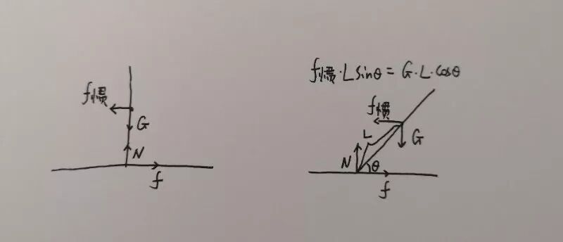 在非惯性系中摩托车的质心会受到离心力f,如果以车和地面接触点为参考点,离心力f会产生一个力矩导致车向左倒。但如果车身倾斜,重力也会提供一个力矩抵消离心力的作用,两者满足图中的关系时,车子就会稳定下来。可以看出当半径变小,离心力变大,只有压低车身才能继续使摩托处于稳定状态。