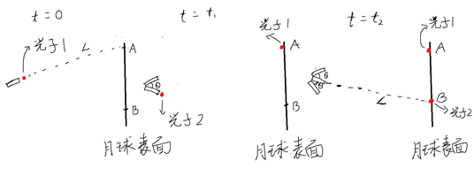 但这并不违背“真空光速是物质运动的最大速度”。从上面的推导可以看出,虽然我们认为“光束在移动”,但其实并没有什么东西真的在月球表面移动,只不过是一系列不同的光子依次到达月球表面形成有光在月球表面移动的一种“视力错觉”,如果条件允许,我们在一个角度内摆放很多激光源,然后依次打开,得到的效果其实是差不多的。