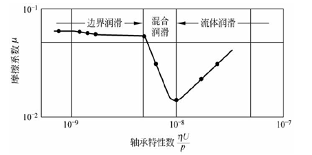 根据Stribeck模型,摩擦系数与轴承特性数之间存在下图所示的关系。这里,η为润滑油粘度;U为滑动速度;p为轴承单位面积载荷。