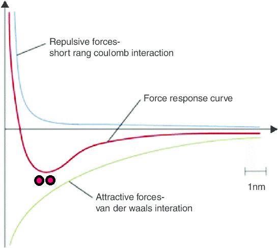 首先要明确一点,化学键的成键原因有很多,比如带有不同电荷之间的离子之间的静电力啦;或者是相邻原子共享电子啦以及不同分子之间的极化导致的相互吸引力啦等等。但是本质是一致的,它们都是由成键双方之间的相互作用导致的。比如说两个带有不同电荷的离子之间吧,首先它们有一个整体上的库伦吸引力(图中绿线)。如果只有这个库伦吸引力的话,他们会不断靠近,但是除此之外,当他们靠近到一定程度的时候,由于他们的原子核都是带正电的,会相互排斥,电子之间也会相互排斥,这个排斥力(图中蓝线)随着距离的拉近会迅速上升以抵消上边提到的相互吸引的力以至于在某个位置达到平衡(图中红线)。处在平衡位置的两个离子之间的距离会在这个平衡距离附近摆动(因为布朗运动)但是不会跟这个距离差太多。