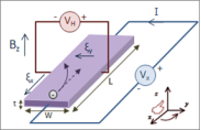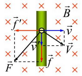 图片中导线以v向右运动,其中电子受到洛伦兹力 f = evB,在洛伦兹力f下,电子以速度 v' 向下运动,受到洛伦兹力 f' = e'vB 。