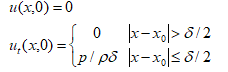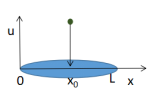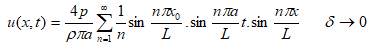 将上述问题简化为一维弦振动问题,如图,冲力F作用在x=x0处使玉盘发生振动,冲力作用使的盘子在x0处在开始振动时有一个瞬间的速度,大小为: