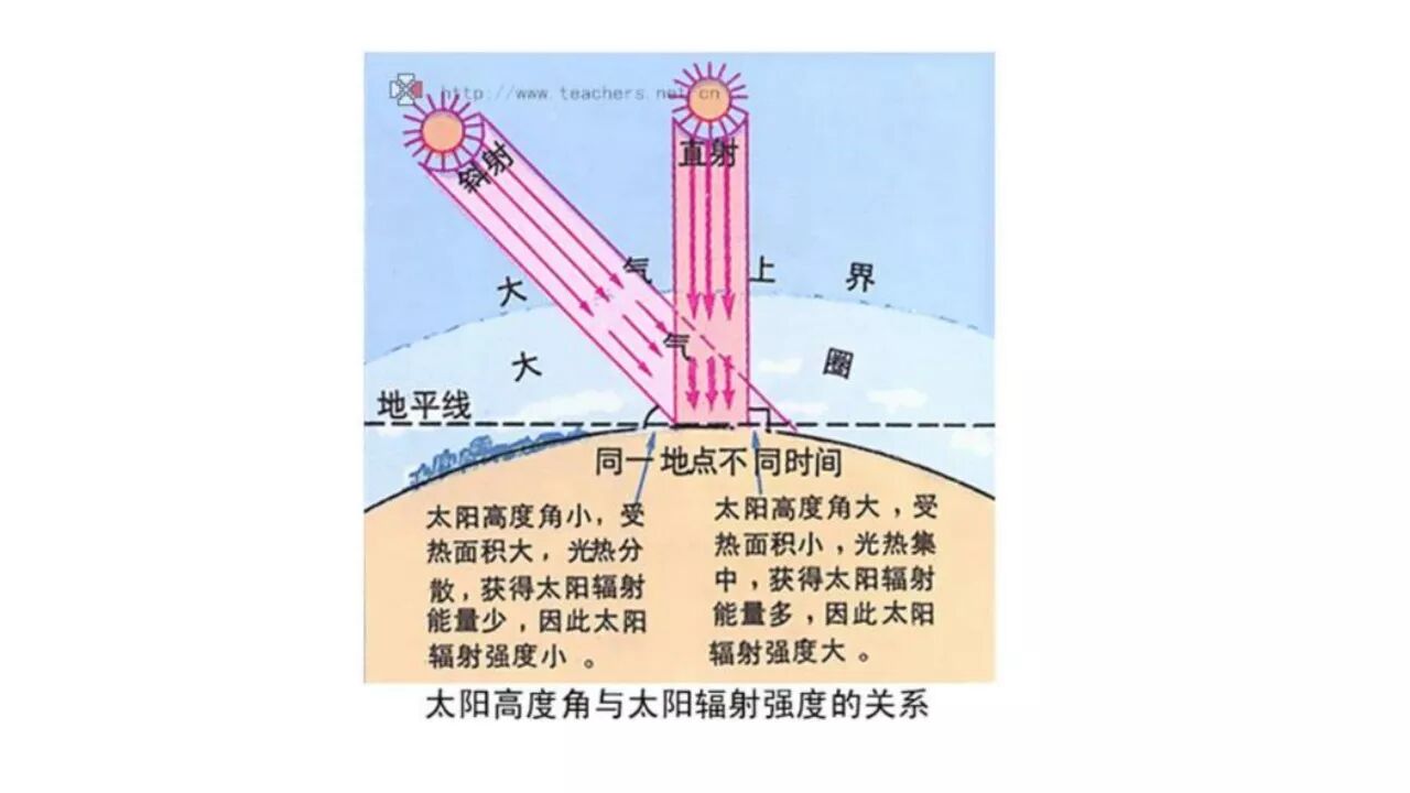 同时我们用太阳辐射强度来定量描述示太阳辐射强弱,单位是W/m2,假设太阳光是平行光,太阳辐射强度就代表单位时间单位面积上太阳辐射的能量多少。影响太阳辐射强度的因素有很多,包括日地距离,海拔高度,大气状态等有关 ,太阳高度角也是很重要的影响因素。从单位上看,前三者主要影响太阳辐射功率,即单位时间辐射的能量,后者主要影响辐射面积。如图二,太阳高度角越小,辐射面积越大,单位面积辐射功率越小,辐射强度越小;反之,辐射强度越大。为了便于理解,我们假想用刀去切一个圆柱,当垂直于圆柱去切时,我们得到最小的面积,是一个圆;而当我们斜切时,得到的是一个椭圆,其短轴为上述圆的半径,长轴大于短轴,其面积∏ab (>∏a2),大于圆的面积,有兴趣的同学可以切一切家里的黄瓜做个实验哦!