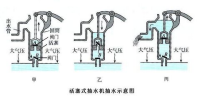 活塞式抽水机或离心泵,虽然技术细节大相径庭,其抽水的物理原理都是利用大气压强。活塞式抽水机结构简单,就是在吸水管道中有一个活塞,活塞与管道中均有阀门,如图。活塞向下运动时,活塞上阀门打开,管道中阀门关闭,水流到活塞之上。向上运动时,活塞上阀门关闭,活塞向上运动将水提起,同时管道内欠压,水池中的水(或地下水)在大气压强的作用下顶开管道中活塞,进入管道。早期的抽水机大都为活塞式。