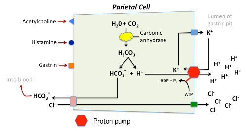 至于酸性,对于我们哺乳动物来说,是唯一可以有所抵抗的,但是仅限于偏酸的食品和饮品,浓硫酸浓盐酸等强酸已经不再是我们所能承受的了。我们的消化道表面有一层由细胞分泌的粘膜,这层粘膜可以保护我们的消化道表面的上皮细胞免受酸性或碱性物质的腐蚀。此外,上皮细胞本身就属于极为结实抗造的细胞类群,进一步扩大了我们对不同酸碱性食物的耐受性。不仅如此,我们的胃中还充盈着胃酸,一个主要由盐酸和蛋白酶组成的pH值低至1.5~3.5的液体(想不到吧,我们自己胃也会分泌盐酸,H+主要来源于壁细胞(parital cells)),pH2.7的可乐等酸性饮料食物在胃酸面前不过是小巫见大巫,在经过胃消化之后,与胃酸一道进入十二指肠,在这里与肠道分泌的碳酸氢钠相中和,成为相对碱性的混合物并最终被吸收或排出体外。