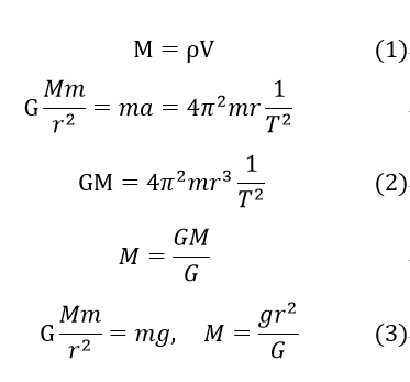在公式(1)中,地球体积V可由技术测量决定,平均密度可由Schiehallion实验决定;公式(2)中的r为卫星运动半径、T为其运动周期;(3)中r为地球半径、g为测量点重力加速度。