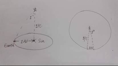 秒差距是天文学中常用的距离单位,是由三角测距法引出的概念。在三角形中,如果我们知道底边长度和两个角的大小,我们就可以知道两个侧边长度。天文学家依据这个原理来测量遥远天体的距离。当观测者从一个位置垂直于此时的视线平移到另外一个位置时,两个观测点和星体的连线会有一个夹角,相当于三角形中底边对应的顶角,也就是“视差”。在星体非常远的情况下,在我们可以移动的距离内,两个侧边的差别就可以忽略不计了,而两个底角接近直角。这个时候得到侧边长就是我们距离遥远星体的距离。依此,人们将秒差距(pc)定义为:平移一个天文单位(日地平均距离,AU)引起的视差为1”时,观测者和天体的距离为一个秒差距。现在假想我们在这个遥远天体上看观测者,观测者移动了一小段距离,这个距离所对应圆心角为1”,此时弦长和弧长也近似相等。秒差距也就是1AU的弧长对应1”的圆心角时该圆半径的大小。这样算出秒差距约为3.26光年。
