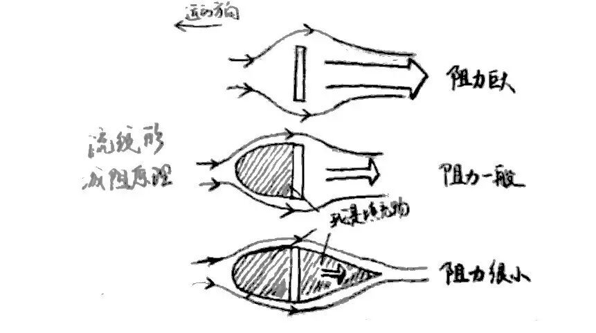 一个物体在空气中运动所受阻力的来源主要有两部分:一部分是摩擦阻力,又叫粘滞阻力,也就是和空气摩擦产生的;另一部分是压差阻力,是运动物体前方高压区和后方低压区产生的压差引起的力。我们都知道,一块垂直在空气中运动的平板会受到较大的阻力,如果把平板前方(左侧)的高压区用半椭球状的物体填满(如图),那么气流在前方早一点贴合物体,就会使前方压强变小;如果把平板后方的湍流区用一个圆锥状的物体填满,那么后方的气流就会相对较晚地分离,使得后方压强变大,这样就能够减小压差阻力,这就是流线型减阻的原理。