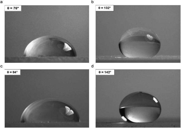 当然,比疏水和亲水更严格的说法应该是浸润和不浸润。比如水滴在石蜡,汞在玻璃上,都是典型的不浸润。浸润和不浸润是由液滴和界面之间的接触角定义的,接触角小于90°为浸润,反之为不浸润(本质上是由吉布斯自由能决定的,这里不深入讨论),例如: