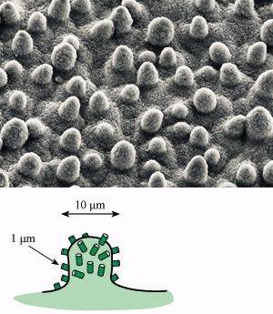 我们触摸荷叶的表面时会发现一些粗糙的结构,这是因为荷叶的表面有很多个微米级的蜡质乳突结构。如果我们用电子显微镜接着观察这些结构,会发现这些结构表面又附着着与这类结构相似的,但是却更小的纳米级颗粒。这些称为荷叶的微米—纳米双重结构,这一类结构排列非常紧密,以至于在其周围形成了类似于气垫的东西,就是这些气垫造成了荷叶疏水的特点。(如果把荷叶浸在水下10米左右一段时间,由于压力的作用,气垫内的空气被排出,荷叶就会变得亲水。)