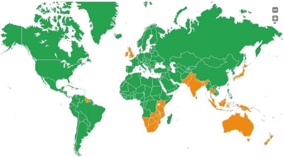 图2.绿色标记靠右行驶的国家,黄色标记靠左行驶的国家。(来源:List of left- & right-driving countries)