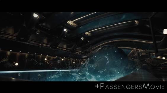 《太空旅客》剧照:大表姐在游泳时,引力系统发生故障,被困在水球中。