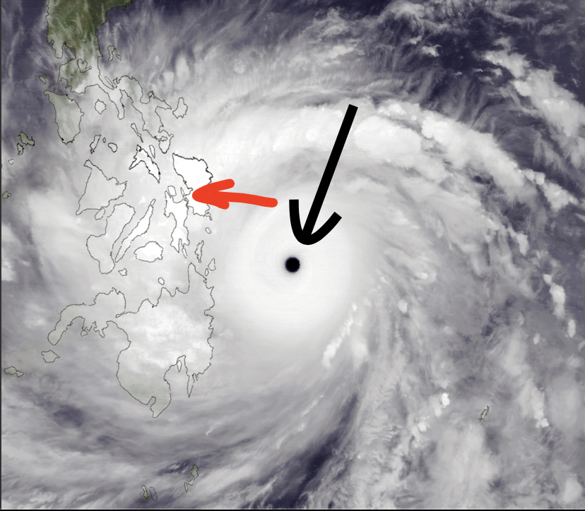 因为我们的天气预报基本只报道北半球的台风。所谓台风,本质上就是高强度的低压热带气旋。之所以叫低压气旋,就是因为台风眼,也就是下图中间那个黑的地方气压是低的。这样一来,周围的空气就会朝着台风眼流(空气会从高气压的地方流向低气压的地方-如下图黑色尖头所示)。