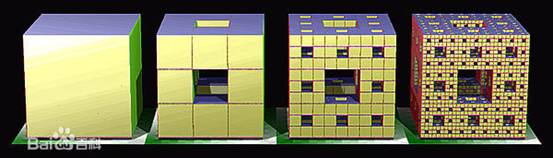 首先来看看一个魔方,然后我们去掉中心的七个小块,但这样不够,我们继续再将上面的操作用在剩下的小方块中,于是变成第三个图所示的那样,这样一直继续下去,那么,脑洞大开的问题来了,这个像海绵一样的“鬼东西”的维度是多少???