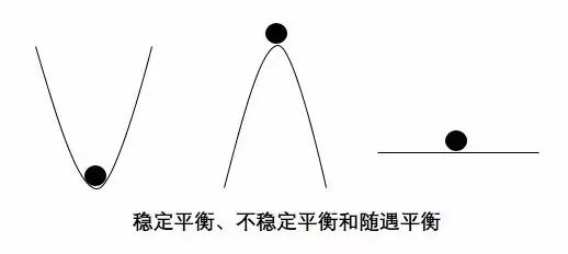 对于平衡位置,首先需要区别几个概念:稳定平衡、不稳定平衡、随遇平衡。比如一个小球放在山谷,山顶和平地上都存在受力平衡位置,对应之前提到的三种平衡方式。三种状态都是平衡状态,那它们又有什么区别呢?