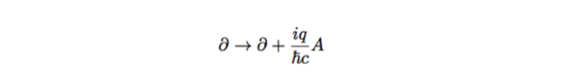 要想让薛定谔方程的形式不变,我们就必须在我们的方程中引入一个其他的东西来消掉局域规范变换多出来的项。加的这个这个东西就是所谓的电磁场,因为我们知道电磁场也有一个规范自由度,恰好让多出来两项相消~~也就是说,在薛定谔方程中,做如下替换,那么我们将得到,一个在规范变换下不变的薛定谔方程~~