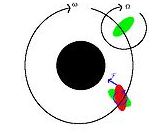 为什么呢?首先双星系统中,完美的球体已经不是引力势能最低的最优解了,椭球才是。我们假设现在月球已经被捏成了一个小椭球。关键来了,如果月球自转速度与公转速度不同,那么随着时间推移。椭球的长轴就会偏离地月连线。如果自转比公转快,如图,那么引力就会把椭球往后拉,慢慢减小自转速度。如果公转比自转快,那引力就会把椭球往前拉,慢慢增加自转速度。这个过程如果不损失机械能,则会使得月球的自转速度反复的增加减小,形成潮汐共振。