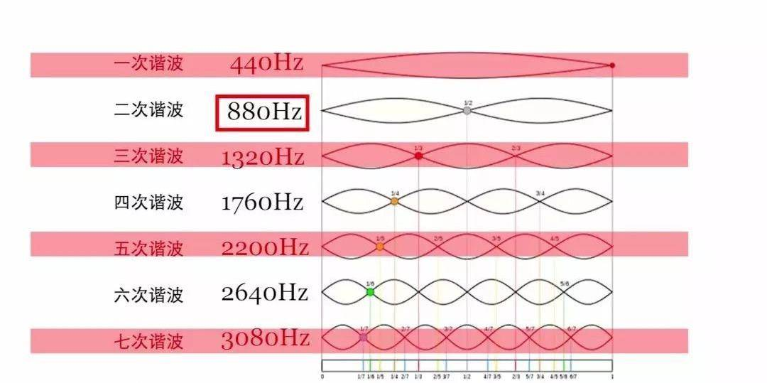 假设这是吉他上五弦空弦振动时的分解图,当我们把手指轻放在它的正中间位置时,就会导致一、三、五、七以及其他所有奇数的谐波被抑制,只有以此触点为节点的振动被保留,即以二次谐波为首的所有偶数谐波并不受影响,并且因为这些谐波所产生的频率的最大公约数为880赫兹,所以拨响之后我们就可以得到一个非常清晰的音高为880赫兹的第一泛音。