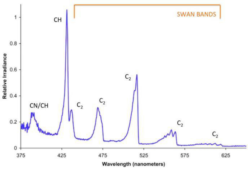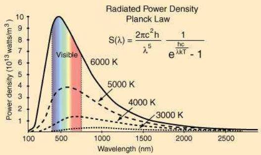 )形式辐射出来。这种发光的频率成分完全由不同元素的分子能级决定。而碳氢元素完全燃烧的光谱如图2所示,其中四百多纳米的光最多,这个波段的光对人眼来说大概就是蓝色。