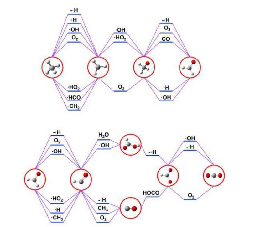 烃类物质的完全燃烧是一个复杂的化学反应(如图1),反应过程产生CH、C2、CHO等中间产物。这些中间产物的电子在不同能级之间跃迁,就会发出特定频率的光子。比如电子从