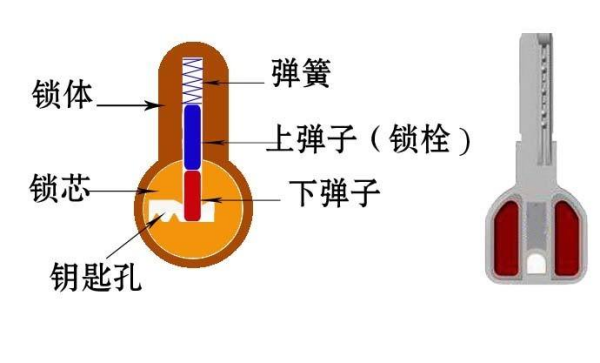 传统常见的弹子锁的基本结构包括锁芯、弹子[dàn zǐ]、弹簧、锁舌组成。如下图所示,当我们未放入钥匙的时候,锁内的蓝色的平头弹子往下推,令锁芯不能转动;当我们放入正确的钥匙的时候,蓝色的平头弹子、红色的下弹子之间的空位成一直线,与黄色的锁芯对齐。当弹子之间的空位与转线对齐,黄色的锁芯便可转动开锁。铁丝的原理同样如此,找准角度与弹簧弹子发生一定的挤压与锁芯相脱离,铁丝就能发挥钥匙的作用把锁打开了,因此这种传统的锁的安全性也是非常低的。现在广泛使用的防盗门上的门锁排列更加复杂,有些还会加上各种电子防盗手段,就很难利用铁丝的方式将之撬开了。