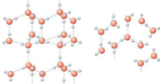 由于水分子间的氢键有特定的长度和角度,使得水分子不能靠得过近且在特定方向上才能形成。温度较高时,水分子无序排列,氢键较少,每个水分子一般只有 1 ~ 2 个氢键,而当温度逐渐降低,水分子无规热运动减弱,分子会逐渐趋于靠近并规则排列,此时一个水分子能形成4个氢键,形成四面体结构,导致水分子之间的距离变大,密度减小,如下图所示。