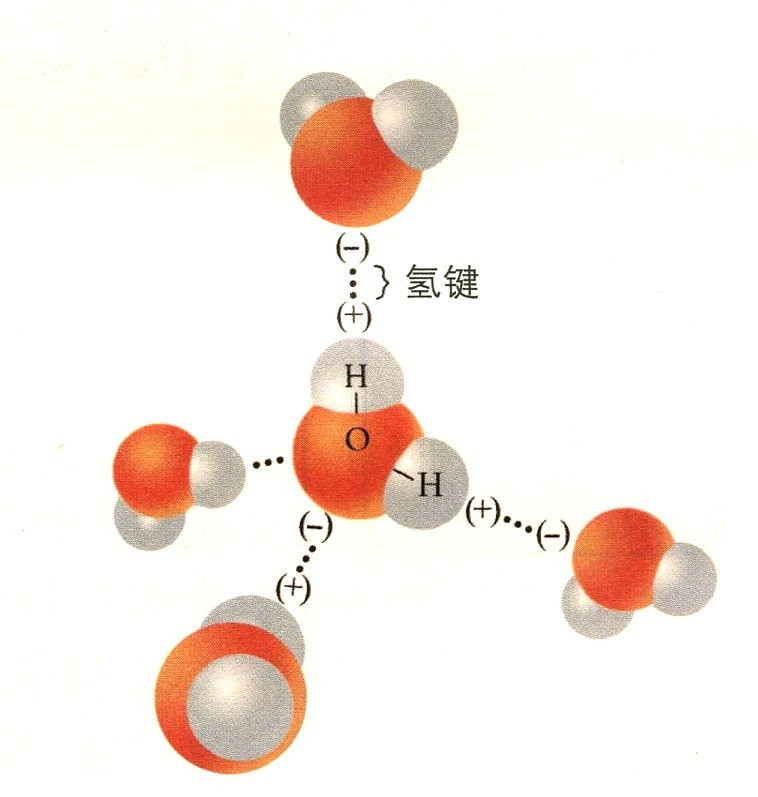 那么水的特别之处在哪里呢?我们知道水的分子是由一个氧原子连接两个氢原子组成的,而氢原子有一种特别的“超能力”——超级喜欢你(N、O、F原子)——氢键。在水中,某个水分子里的氢原子和相邻水分子的氧原子相互靠近时会产生分子间相互作用,形成氢键,在一水合氨分子,DNA双螺旋结构中也能找到氢键的存在。如下图所示,一个水分子可以通过氢键的作用与另外4个水分子结合。