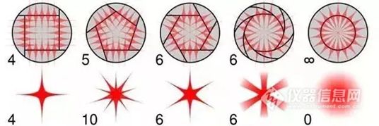 利用光圈时,具体的形状总可以通过波动光学计算得到。如图所示,使用了不同的光圈(改变光圈的口径和形状),也就得到了不同的星芒。