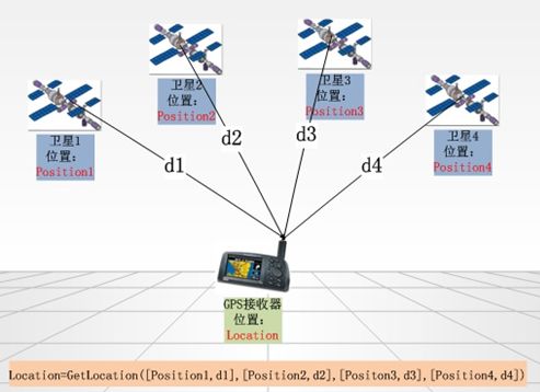 如图所示,四颗卫星的位置是和与GPS接收器的距离是非常容易获取的。运行于宇宙空间的GPS卫星,每一个都在时刻不停地通过卫星信号向全世界广播自己的当前位置坐标信息和时间信息,任何一个GPS接收器都可以通过天线很轻松地接收到这些信息。GPS接收器收到数据包后,用当前时间减去时间戳上的时间,就是数据包在空中传输所用的时间了,乘以传输速度,得到数据包在空中传输的距离,即卫星与GPS接收器之间的距离。要求解GPS接收器在三维空间中的位置,数学上讲只需要三颗卫星的位置和它们分别与GPS接收器的距离即可(三个未知数需要构建三个方程),而在GPS定位系统中利用四颗卫星的位置信息进行校对,来消除误差。影响GPS定位精度的影响因素有很多,依据上述模型中的不同过程可以有卫星星历误差、卫星钟差以及卫星信号发射天线相位中心偏差等等。