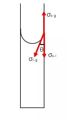 根据杨氏方程:σs-g=σs-l+σl-g cosθ,σ表示各相之间的表面自由能,在水和玻璃的情况下,σl-g > σs-g-σs-l,接触角是一个小于90°的角,表明水润湿玻璃,因而平衡状态下各相之间的表面自由能差值就是那股让水面凹陷的神奇力量。