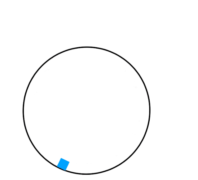 如果更细致地去研究这个问题,尤其是想弄明白被甩到一边的骰子是如何立起来的话,就需要使用简单的运动分析和力学分析。杯子和骰子的运动和下图类似:摇晃杯子让杯子绕着偏离圆心的某个点做圆周运动,同时骰子永远在距离圆周运动中心最远处的水杯内侧壁。让骰子在桶里转起来,并不需要很大的力,关键是摇晃杯子的时候要使用稳定的频率以及合适的力度。