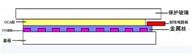 在这里以电容技术触摸屏为例进行说明(当然还有其他如电阻屏等类型的触摸屏,但是电容屏相对应用更广)。我们的手机屏幕其实是一块四层复合玻璃屏,其结构大致如下图: