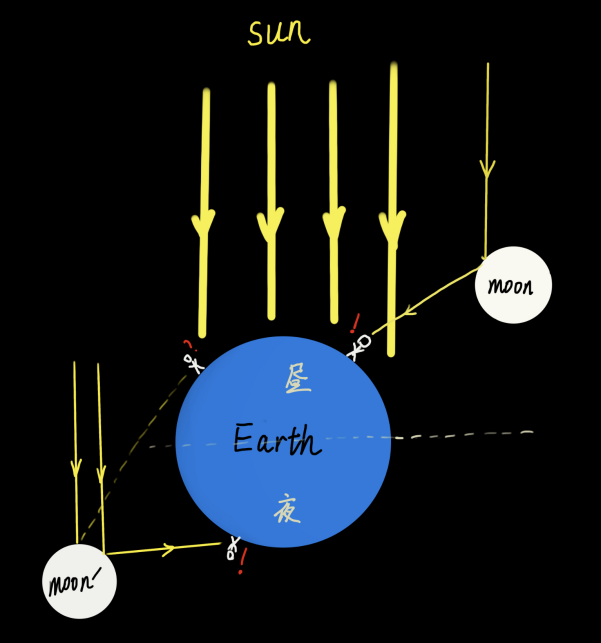 上面这幅图是一个简单的示意图。因为太阳很远,所以射向地球的光线近似于直线,蓝色的是地球,白色的是月亮,黄线是太阳发出的光。图中有两个不同位置的月亮,分别对应了不同日期和时刻,月亮的大致位置。穿过地球中心的虚线是晨昏线,线的上面是白昼,下面是夜晚。右上角的小人在白天看到了月亮,左下角的小人在晚上看到了月亮,而左上角的小人,因为能看到的月亮的反射光来的角度太低,又很弱,自己又身处白天,月亮的反射光就会被天空的光所掩盖,很难被看到。