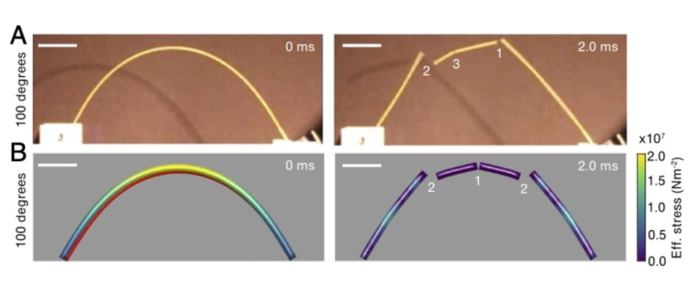 如果略去所有的物理推导而仅作定性的分析,我们可以将产生这样断裂的原因表述如下。对于杆状物体,显然存在一个阈值。当杆的弯曲程度(我们可以用曲率来表述)超过这个阈值时,则杆会在此点发生断裂。而当一根弯曲的杆达到临界值突然折断时,在断点的曲率会一下变为零而释放能量。释放出的能量就以波的形式在杆内传播,这种波被称为弯曲振动波(flexural waves)而这样的振动波在杆内又会局域性地增加杆的曲率,最终导致若干个点的曲率超过阈值,像雪崩一样引发新的断裂。这就是为什么杆状物体往往不只断裂成两段的原因。