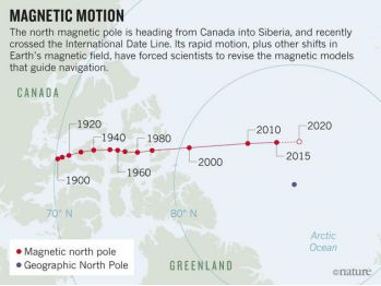 地磁南北极与地理南北极是不同的。我们可以把地磁场看成一个磁偶极,即磁感线交汇于两个极点。地磁场的S极位于北半球,称为地磁北极,N极同理。由于地球上的物质(主要是液态铁组成的外地核)分布在不断变化,影响了磁场分布,地磁北极的位置也是不断改变的,目前,地磁北极的移动大大加快,以每年几十公里的速度漂移。