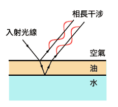 如图所示,油-空气界面的反射光和水-油界面的反射光相干叠加,根据油膜厚度的不同,有些波长的光相干相长,有些波长的光相干相消,在我们看来就像油有了缤纷的色彩一样,是不是很神奇啊~