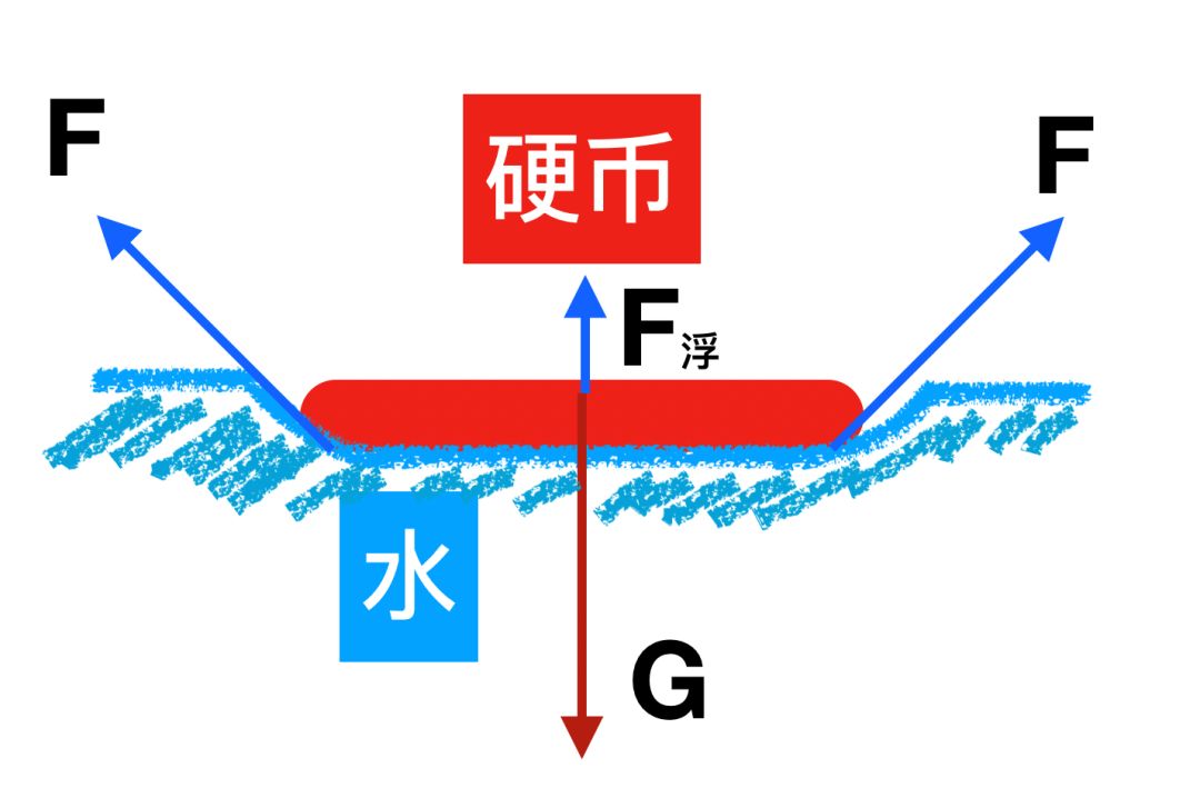 如图所示,把硬币放在水面上之后,水面张力会提供给硬币一个向上的力(蓝色),这个力和硬币受到浮力的合力与重力(红色)抵消,就能够让硬币“浮”起来。