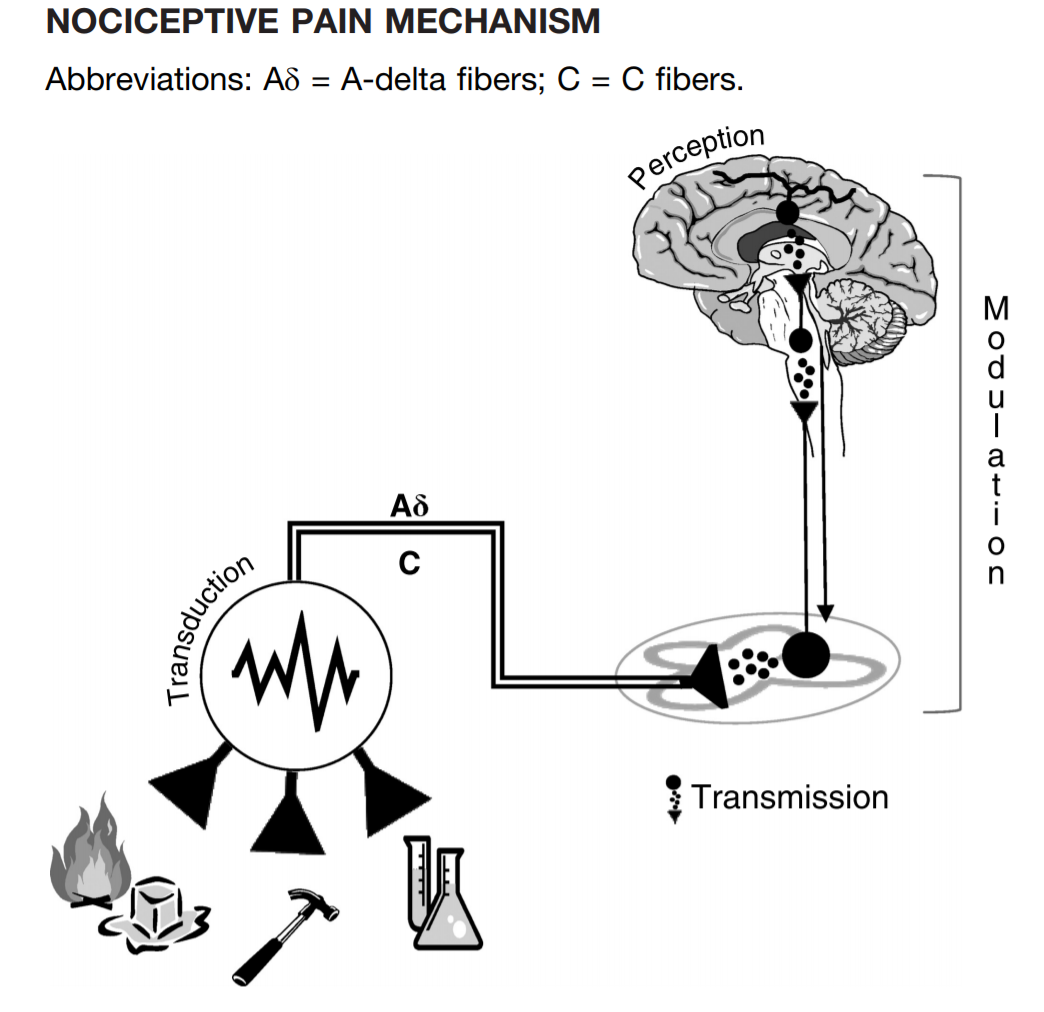 其中伤害性疼痛是机体暴露于有害刺激后立即出现的疼痛。如图所示,伤口及周围的感受器感受有害刺激并转化为电信号,通过外围神经,例如A-δ纤维和C纤维,将疼痛信号传递到中枢神经系统,最终到你的大脑之中。这一过程的目的是通过对有害刺激的迅速反应,防止进一步的组织损伤,也就是所谓的趋利避害。