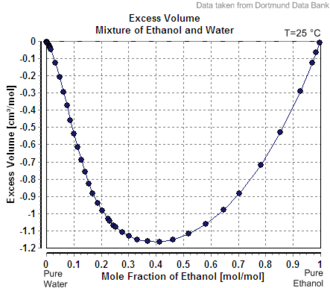 两种液体混合总体积有三种情况,可以小于两种液体体积之和,例如乙醇和水混合,体积减小,体积减少的程度与两者混合前的体积有关(这里不考虑温度的影响),水和乙醇都是极性分子,当水加到乙醇中,两种分子彼此可以自由混合,较小的水分子会被乙醇的羟基所吸引,每个分子都会改变另一个分子的极性场,吸引力使得分子之间比非极性混合物分子之间更加紧密,宏观表现为混合之后总体积变小;混合之后的体积也可以变大,例如甲酸甲酯和乙醇混合、四氯化碳和苯的混合,混合之后的溶液中,分子之间的相互作用力有排斥有吸引,不同种分子之间排斥力更大一些,平衡之后总的相互作用力使得混合之后间距变大,宏观表现为总体积变大;可以等于两液体体积之和,例如油与水的混合,他们两者不相溶,或者是相溶液体混合,在相互作用的综合影响下,也可以使得总体积恰好不变。