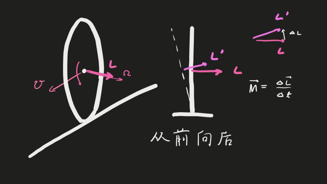 这种自转的角动量正比于角速度大小,也就同时正比于速度的大小。考察车轮的倾倒:车轮倾倒时,角动量