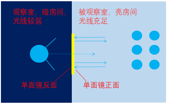 单面镜(也叫原子镜、单向透视玻璃),是一种对可见光具有很高反射比的特种玻璃。一般的玻璃,站在两面都可以看穿到另一面的事物,而普通的镜子只有反射的功能,与一般的透明玻璃或者全反射镜不同,在单面镜的一面可以看到另一面的物体,从另一面却只能看到自己的像。这与玻璃上的镀膜厚度直接相关,如图所示。