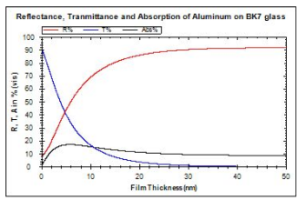 以BK7型号玻璃上的铝膜为例,在玻璃上不镀膜时,透射率远大于反射率,玻璃是透明的(红色-反射率,蓝色-透射率,黑色-吸收率);膜厚度大于20nm左右时,透射率远小于反射率,从玻璃两面入射的光线均发生反射,因此不透光。可以通过控制膜的厚度使玻璃能够反射部分光的同时透过部分光线,合理控制玻璃两侧的光线强弱则可以实现单面镜的功能。