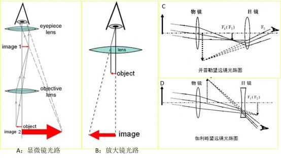 以下我们就从成像过程中有无实像和实像的特点,最终看到的像的特点来看看它们的异同点吧。对于显微镜,物镜成放大倒立的实像,再经过目镜成虚像;开普勒望远镜成缩小倒立的实像,再经过目镜成虚像,而事实上从光路图看,显微镜和开普勒望远镜的目镜都只是一个放大镜,它们的物镜是利用物体在凸透镜一倍焦距至二倍焦距和二倍焦距之外的成像原理,分别成放大倒立的实像和缩小倒立的实像;对于放大镜,物体则在凸透镜的一倍焦距以内,光线的反向延长线汇聚于一点,成虚像。对于两种望远镜(图C,D中的物应该离物镜很远,图中将物箭头拉近了许多),伽利略望远镜中没有实像(可以用光屏承接的像),且目镜是凹透镜;二者之间的共同特点是目镜和物镜都是共焦的,放大倍数等于物镜焦距比目镜焦距。