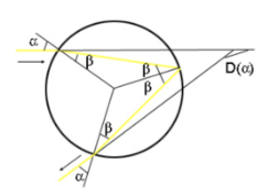 弯曲的彩虹形成以红光为例,一束光线经过球形的水滴,利用斯涅耳定律和反射定律确定其角度偏差定为D(α),大小为:180°+2α-4β,示意图如下:(有兴趣的筒子可以求解一下~)