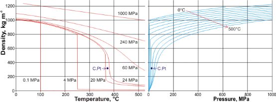 要注意的是,上面仅仅是估算,实际上不需要那么深的水。因为水的密度其实是会随着压强增大而增大,简单的说就是水被压缩了。平时说水不可压缩只是在一些温和的条件下,在题目这种极端条件下,水的密度变化就要考虑。见下面右边那张图,可以发现,0℃下,当压强增加到1GPa的时候,水的密度都已经超过了1200kg/m3。